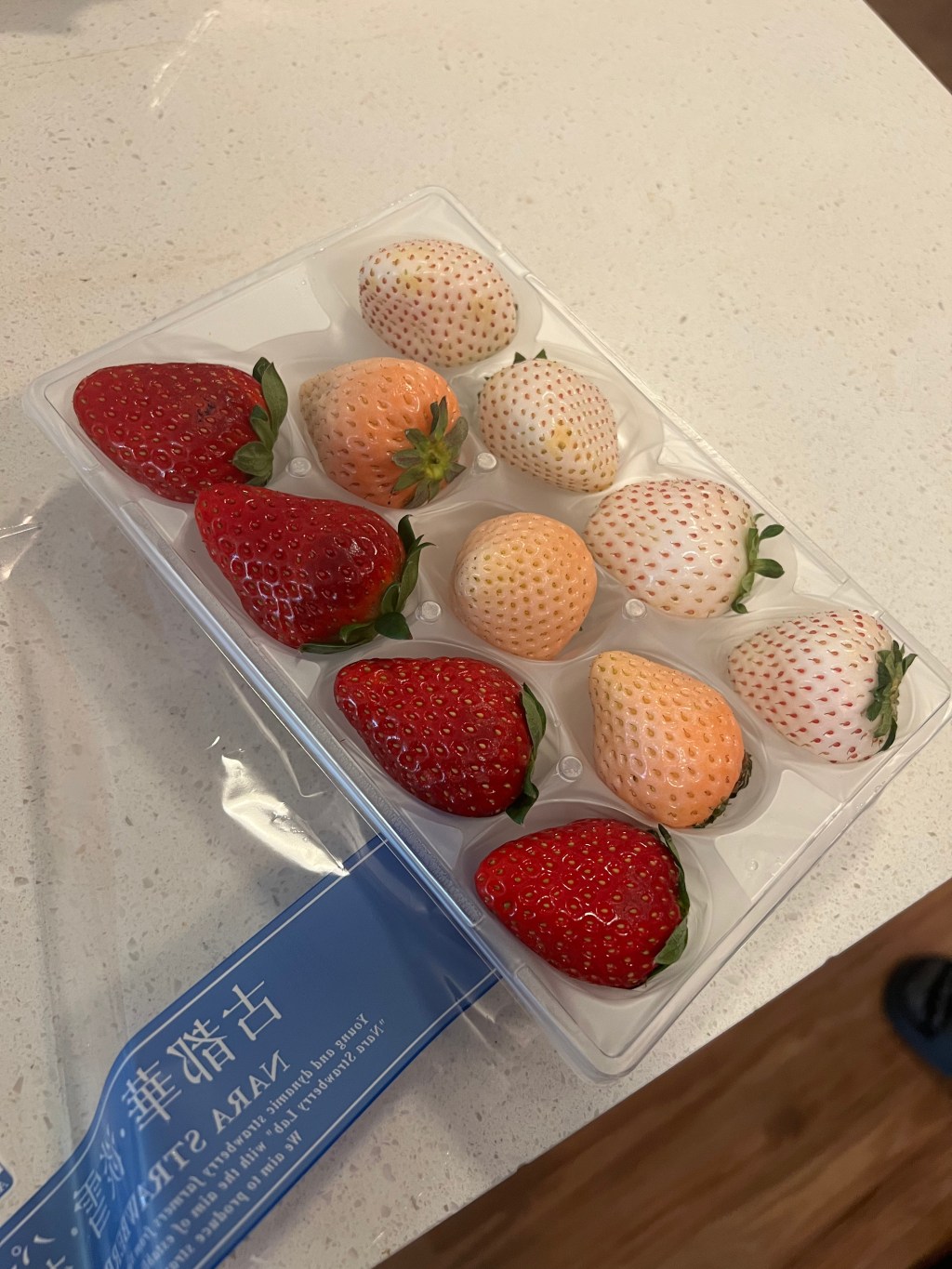 旧金山这片区域,亚洲人口很多。有各类日本超市、中国超市来满足亚洲食品的需求。今天我终于下定决心,买了这包三种颜色的日本草莓。从小,我就对日本的食物抱有一种很高的敬意。不仅因为日本食品安全做得好,更因为在新闻和电视里,日本人做任何事情都有种匠人精神。不管事情大小,他们总能把它讲成一个带有家族历史与传承感的故事。